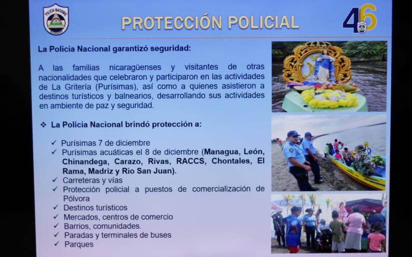 “La Policía Nacional garantizó seguridad a las familias nicaragüenses y visitantes de otras nacionalidades que celebraron y participaron en las actividades de La Gritería, Purísima, así como a quienes asistieron a destinos turísticos y balnearios, desarrollando sus actividades en ambiente de paz, seguridad y tranquilidad”, dijo Obando.