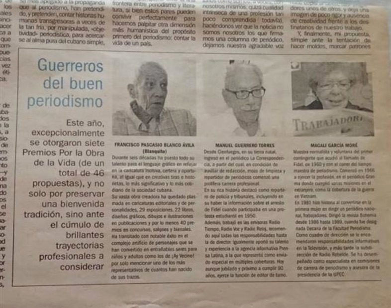 “Me siento orgulloso de los años que le he dedicado al periodismo, de la calidad de mi trabajo. Son reconocimientos a mi labor profesional y los recibo como tal. El año pasado, para mi cumpleaños, vino el presidente de la Unión de Periodistas de Cuba, Ricardo Ronquillo y me trajo un cake, fue un gran honor para mí recibirlo. Espero que este año, también venga, no por el cake, sino por el reconocimiento a mi trabajo”, manifestó emocionado.