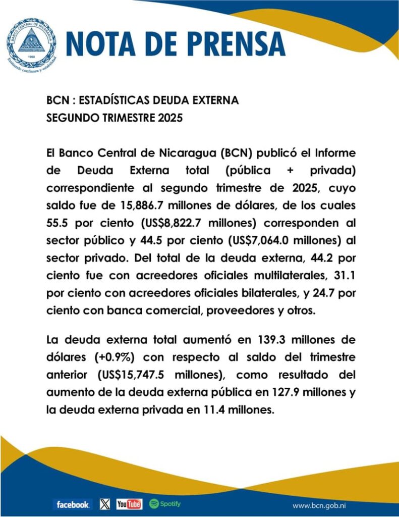 El Banco Central de Nicaragua (BCN) publicó el Informe de Deuda Externa total (pública + privada) correspondiente al segundo trimestre de 2025, cuyo saldo fue de 15,886.7 millones de dólares, de los cuales 55.5 por ciento (US$8,822.7 millones) corresponden al sector público y 44.5 por ciento (US$7,064.0 millones) al sector privado. Del total de la deuda externa, 44.2 por ciento fue con acreedores oficiales multilaterales, 31.1 por ciento con acreedores oficiales bilaterales, y 24.7 por ciento con banca comercial, proveedores y otros.