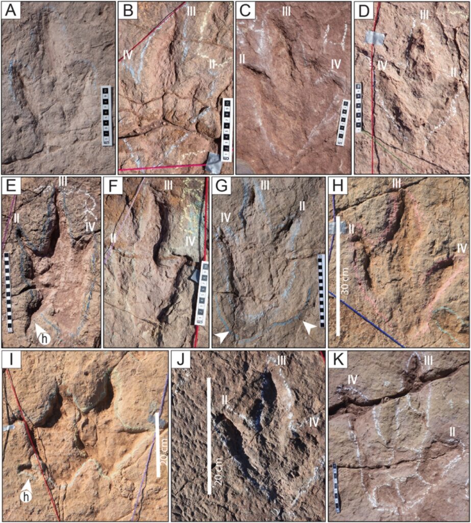 Los diferentes tamaños de las huellas dejan ver que por allí pasaron especímenes enormes, de hasta 10 metros de altura, junto a otros apenas del tamaño de una gallina, con apenas unos 32 centímetros de altura.