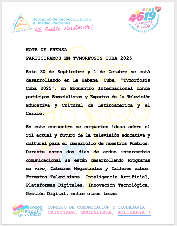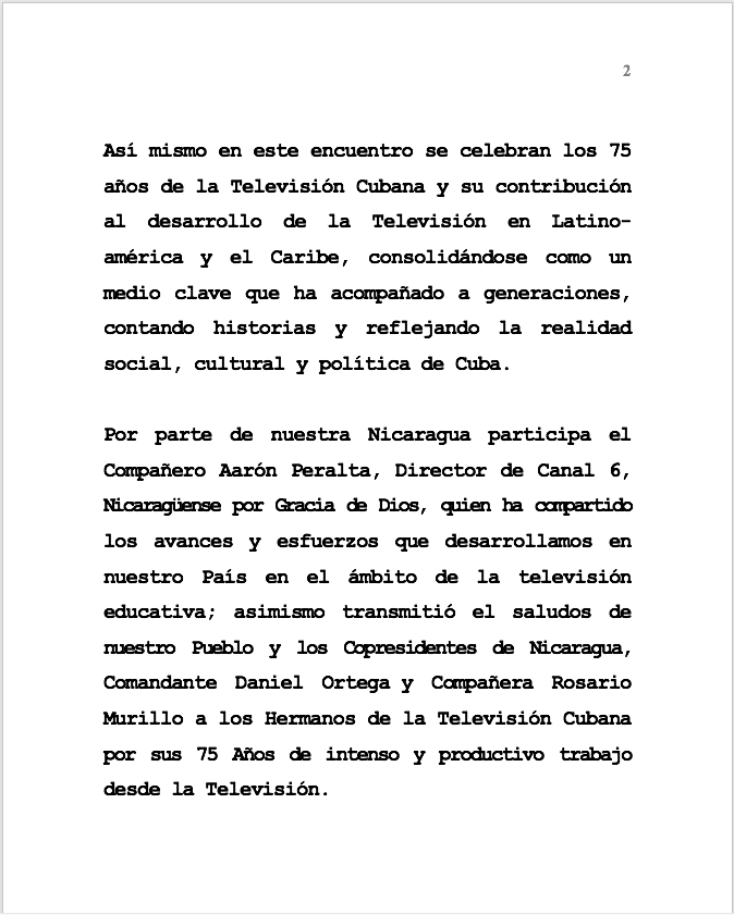 Por parte de nuestra Nicaragua participa el Compañero Aarón Peralta, Director de Canal 6, Nicaragüense por Gracia de Dios, quien ha compartido los avances y esfuerzos que desarrollamos en nuestro País en el ámbito de la televisión educativa; asimismo transmitió el saludos de nuestro Pueblo y los Copresidentes de Nicaragua, Comandante Daniel Ortega y Compañera Rosario Murillo a los Hermanos de la Televisión Cubana por sus 75 Años de intenso y productivo trabajo desde la Televisión.