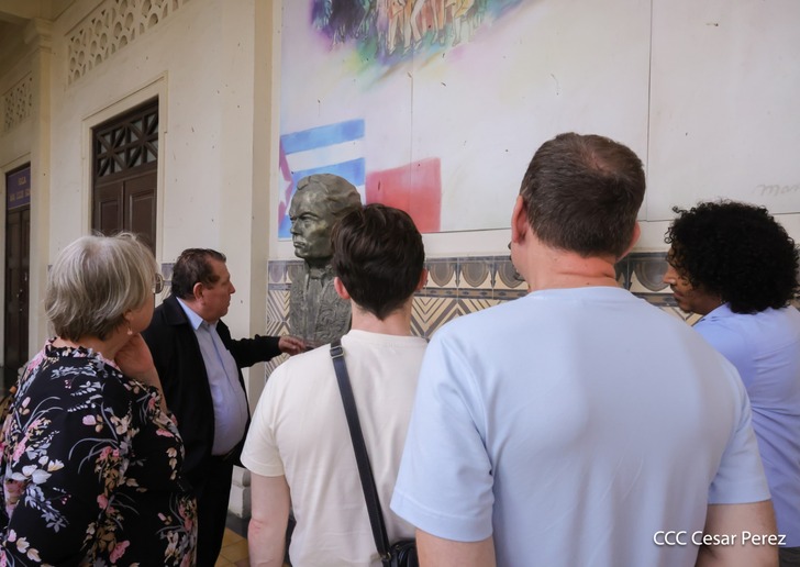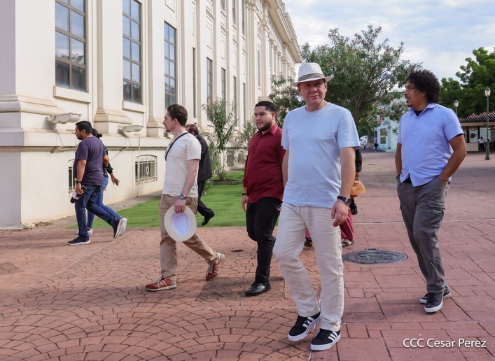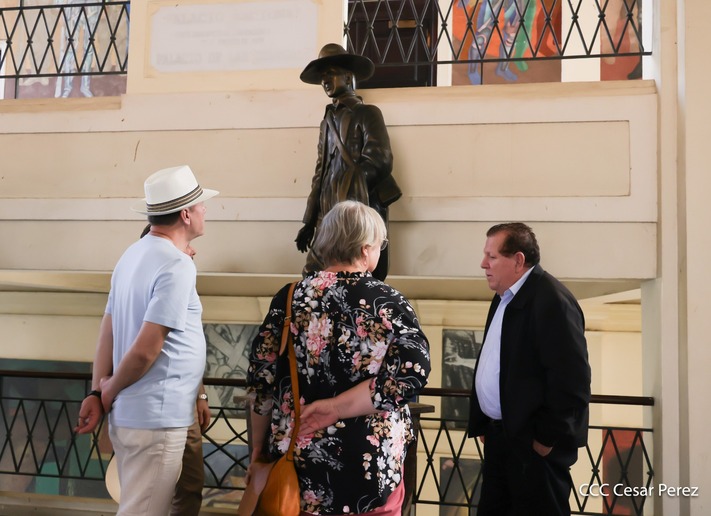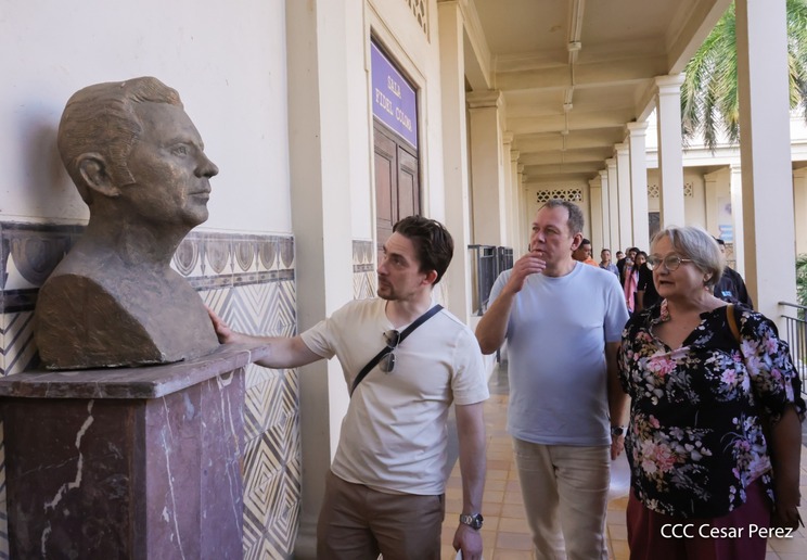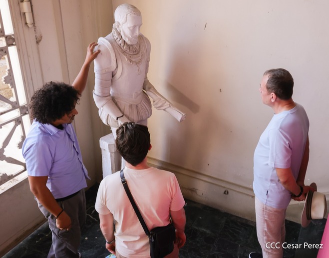 Los escultores Alexey Chebanenko y Andrey Biely, de la Federación de Rusia, acompañados por el maestro Ramón Rodríguez, también realizaron un recorrido por el Teatro Nacional Rubén Darío, en Managua.