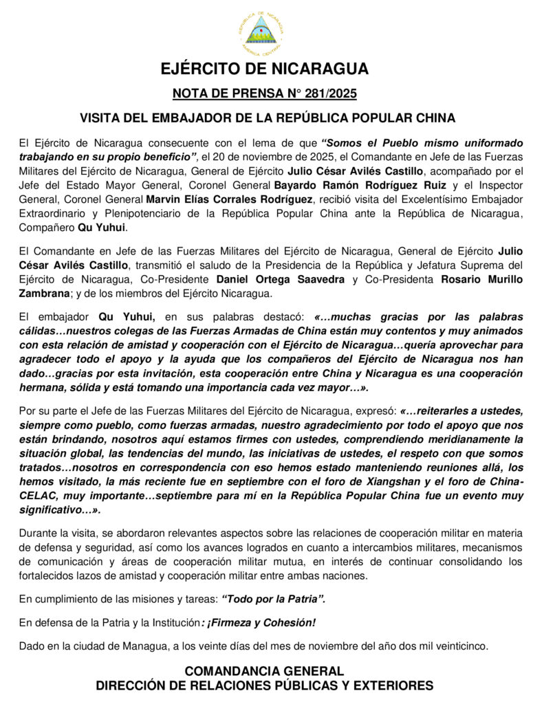 El Ejército de Nicaragua consecuente con el lema de que “Somos el Pueblo mismo uniformado trabajando en su propio beneficio”, el 20 de noviembre de 2025, el Comandante en Jefe de las Fuerzas Militares del Ejército de Nicaragua, General de Ejército Julio César Avilés Castillo, acompañado por el Jefe del Estado Mayor General, Coronel General Bayardo Ramón Rodríguez Ruiz y el Inspector General, Coronel General Marvin Elías Corrales Rodríguez, recibió visita del Excelentísimo Embajador Extraordinario y Plenipotenciario de la República Popular China ante la República de Nicaragua, Compañero Qu Yuhui.