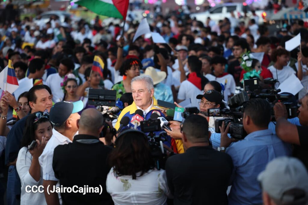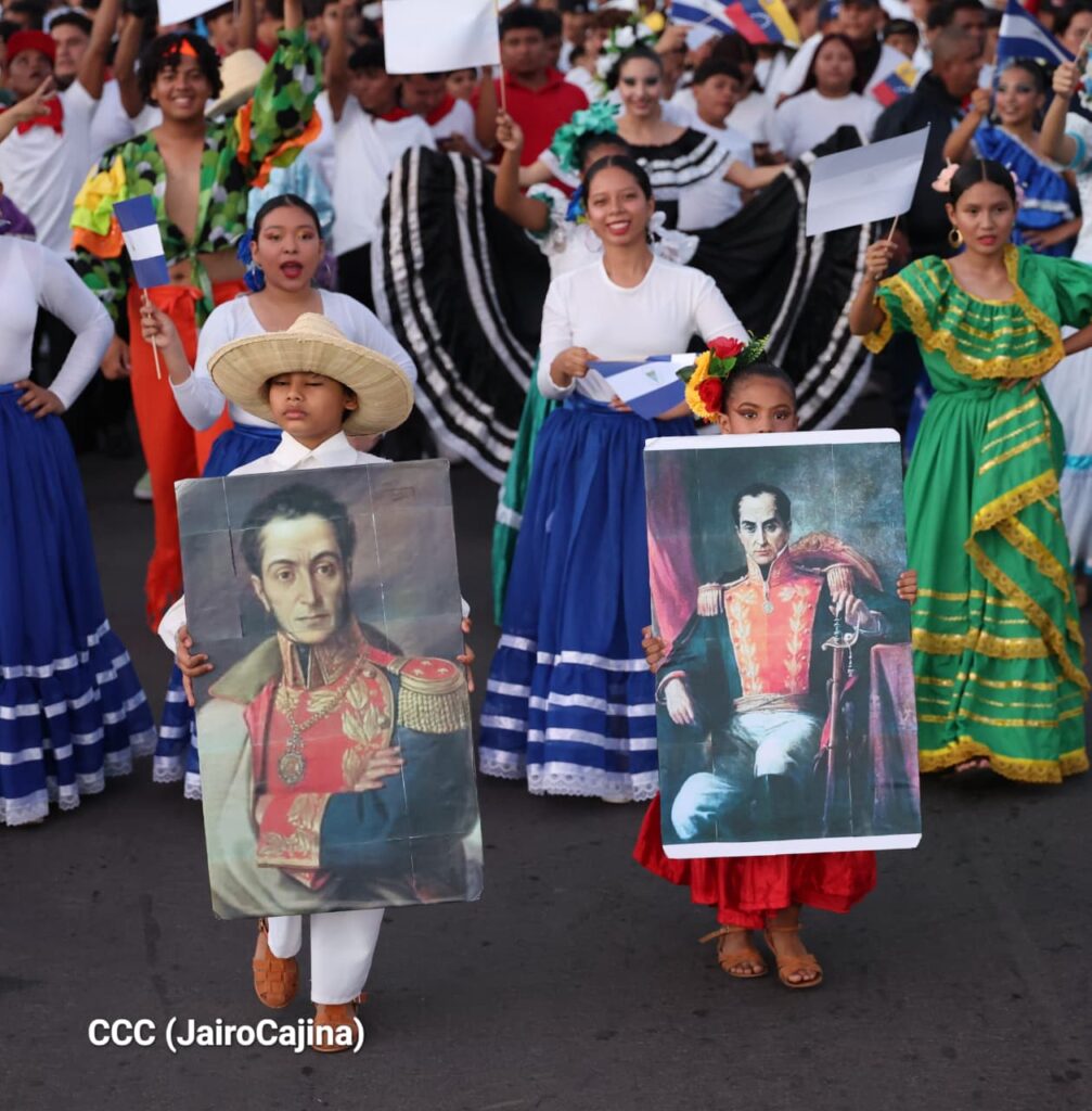 “La Juventud de Sandino, de Daniel, de Rosario, del Frente Sandinista, hoy le decimos presente al Libertador, Simón Bolívar, y al pueblo venezolano que cuentan con la fuerza, la valentía y el apoyo del pueblo nicaragüense y les decimos que la libertad ya es del pueblo venezolano. A través de este homenaje, le decimos al pueblo venezolano que somos repúblicas hermanas”, finalizó Álex Galeano, de la Juventud Sandinista.
