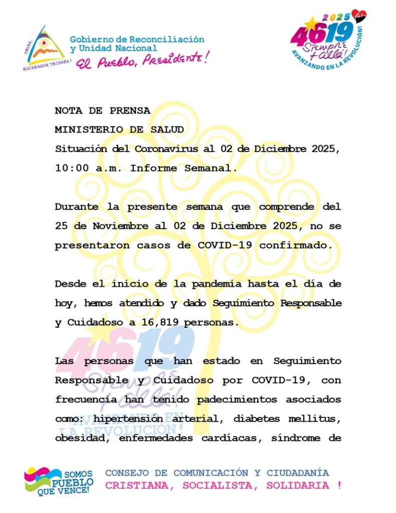 Durante la presente semana que comprende del 25 de Noviembre al 02 de Diciembre 2025, no se presentaron casos de COVID-19 confirmado.