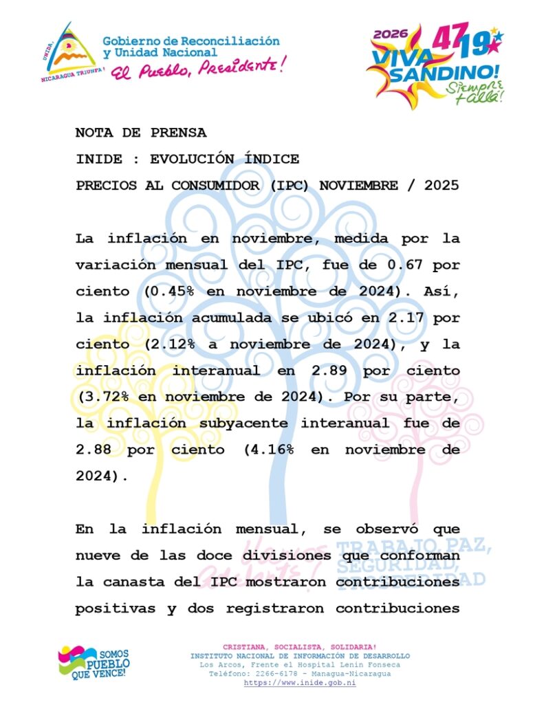 INIDE reporta inflación de 0.67 por ciento en noviembre 2025