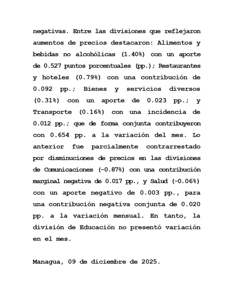 En la inflación mensual, se observó que nueve de las doce divisiones que conforman la canasta del IPC mostraron contribuciones positivas y dos registraron contribuciones negativas. Entre las divisiones que reflejaron aumentos de precios destacaron: Alimentos y bebidas no alcohólicas (1.40%) con un aporte de 0.527 puntos porcentuales (pp.); Restaurantes y hoteles (0.79%) con una contribución de 0.092 pp.; Bienes y servicios diversos (0.31%) con un aporte de 0.023 pp.; y Transporte (0.16%) con una incidencia de 0.012 pp.; que de forma conjunta contribuyeron con 0.654 pp. a la variación del mes. Lo anterior fue parcialmente contrarrestado por disminuciones de precios en las divisiones de Comunicaciones (-0.87%) con una contribución marginal negativa de 0.017 pp., y Salud (-0.06%) con un aporte negativo de 0.003 pp., para una contribución negativa conjunta de 0.020 pp. a la variación mensual. En tanto, la división de Educación no presentó variación en el mes.