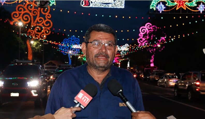 El jefe de sección de línea de ENATREL, don Marlon Hernández, compartió detalles de la instalación del árbol navideño en la plaza de la Revolución.