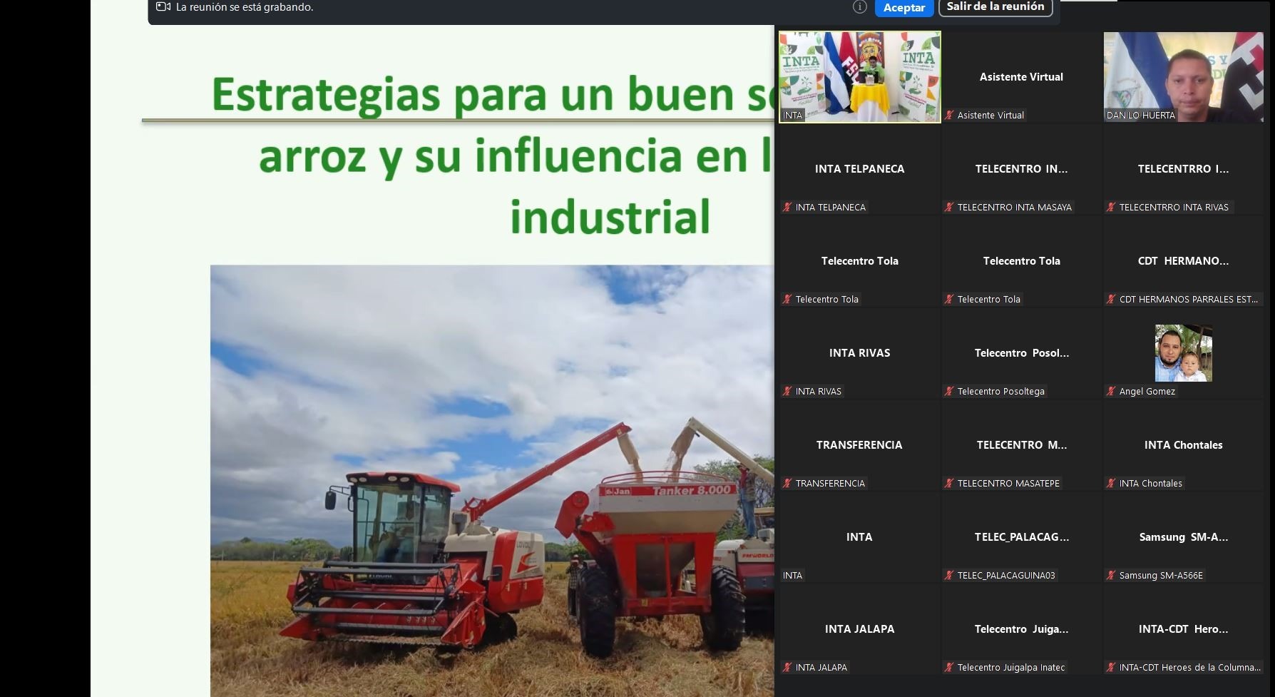 El INTA desarrolló una Conferencia Nacional Virtual sobre: Estrategias para un buen secado en el arroz y su influencia en la calidad del grano, desde el Centro Nacional de Experimentación en Arroz «Comandante Edén Pastora», en el muni-cipio de Darío, departamento de Matagalpa, con la participación de productores conectados desde los Telecentros del INTA.