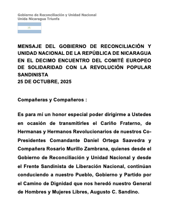 MENSAJE DEL GOBIERNO DE RECONCILIACIÓN Y UNIDAD NACIONAL DE LA REPÚBLICA DE NICARAGUA EN EL DECIMO ENCUENTRO DEL COMITÉ EUROPEO DE SOLIDARIDAD CON LA REVOLUCIÓN POPULAR SANDINISTA