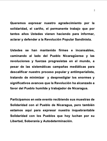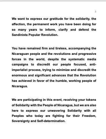 Participamos en este evento recibiendo sus muestras de Solidaridad con el Pueblo de Nicaragua, pero también estamos aquí para expresar nuestra inquebrantable Solidaridad con los Pueblos que hoy luchan por su Libertad, Soberanía y Autodeterminación.