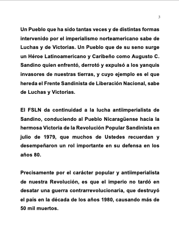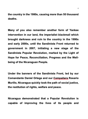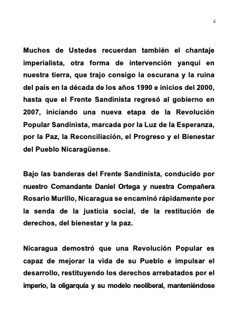 Many of you also remember another form of Yankee intervention in our land, the imperialist blackmail which brought darkness and ruin to the country in the 1990s and early 2000s, until the Sandinista Front returned to government in 2007, initiating a new stage of the Sandinista Popular Revolution, marked by the Light of Hope for Peace, Reconciliation, Progress and the Well-being of the Nicaraguan People.
