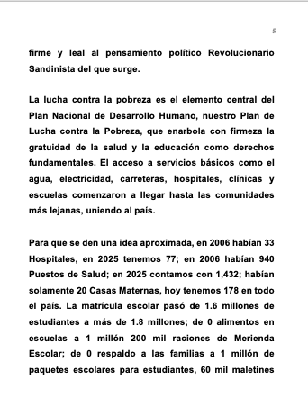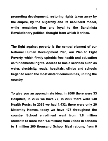 Para que se den una idea aproximada, en 2006 habían 33 Hospitales, en 2025 tenemos 77; en 2006 habían 940 Puestos de Salud; en 2025 contamos con 1,432; habían solamente 20 Casas Maternas, hoy tenemos 178 en todo el país. La matrícula escolar pasó de 1.6 millones de estudiantes a más de 1.8 millones; de 0 alimentos en escuelas a 1 millón 200 mil raciones de Merienda Escolar; de 0 respaldo a las familias a 1 millón de paquetes escolares para estudiantes, 60 mil maletines para docentes; de 27 mil aulas en ruinas a más de 36 mil aulas nuevas y rehabilitadas. Observemos, en enero de 2007 en Nicaragua un 23% de Analfabetismo, desde 2009, Nicaragua se declaró Libre de Analfabetismo. Y la lista sigue Compañeros y Compañeras y la lista aumentará progresivamente.