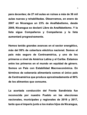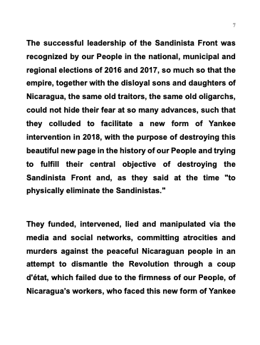 The successful leadership of the Sandinista Front was recognized by our People in the national, municipal and regional elections of 2016 and 2017, so much so that the empire, together with the disloyal sons and daughters of Nicaragua, the same old traitors, the same old oligarchs, could not hide their fear at so many advances, such that they colluded to facilitate a new form of Yankee intervention in 2018, with the purpose of destroying this beautiful new page in the history of our People and trying to fulfill their central objective of destroying the Sandinista Front and, as they said at the time «to physically eliminate the Sandinistas.»