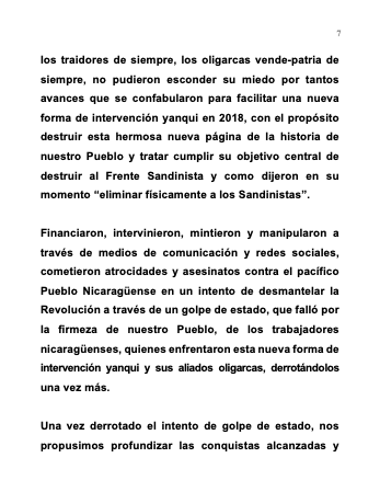 Financiaron, intervinieron, mintieron y manipularon a través de medios de comunicación y redes sociales, cometieron atrocidades y asesinatos contra el pacífico Pueblo Nicaragüense en un intento de desmantelar la Revolución a través de un golpe de estado, que falló por la firmeza de nuestro Pueblo, de los trabajadores nicaragüenses, quienes enfrentaron esta nueva forma de intervención yanqui y sus aliados oligarcas, derrotándolos una vez más.