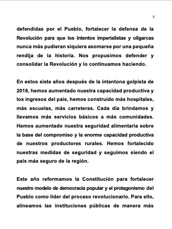 En estos siete años después de la intentona golpista de 2018, hemos aumentado nuestra capacidad productiva y los ingresos del país, hemos construido más hospitales, más escuelas, más carreteras. Cada día brindamos y llevamos más servicios básicos a más comunidades. Hemos aumentado nuestra seguridad alimentaria sobre la base del compromiso y la enorme capacidad productiva de nuestros productores rurales. Hemos fortalecido nuestras medidas de seguridad y seguimos siendo el país más seguro de la región.