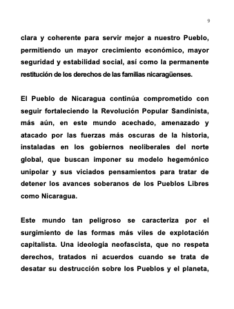 The People of Nicaragua remain committed to continue strengthening the Sandinista Popular Revolution, moreover, in this world stalked, threatened and attacked by the darkest forces in history, installed in the neoliberal governments of the global north, who seek to impose their unipolar hegemonic model and their vicious ideology to try and stop the sovereign advances of Free Peoples like Nicaragua.