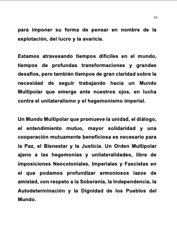 Un Mundo Multipolar que promueve la unidad, el diálogo, el entendimiento mutuo, mayor solidaridad y una cooperación mutuamente beneficiosa es necesario para la Paz, el Bienestar y la Justicia. Un Orden Multipolar ajeno a las hegemonías y unilateralidades, libre de imposiciones Neocoloniales, Imperiales y Fascistas en el que podamos profundizar armoniosos lazos de amistad, con respeto a la Soberanía, la Independencia, la Autodeterminación y la Dignidad de los Pueblos del Mundo.