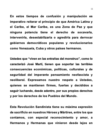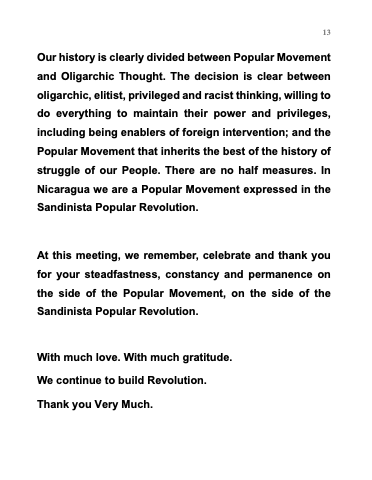 Es para mí un honor especial poder dirigirme a Ustedes en ocasión de transmitirles el Cariño Fraterno, de Hermanas y Hermanos Revolucionarios de nuestros Co-Presidentes Comandante Daniel Ortega Saavedra y Compañera Rosario Murillo Zambrana, quienes desde el Gobierno de Reconciliación y Unidad Nacional y desde el Frente Sandinista de Liberación Nacional, continúan conduciendo a nuestro Pueblo, Gobierno y Partido por el Camino de Dignidad que nos heredó nuestro General de Hombres y Mujeres Libres, Augusto C. Sandino.