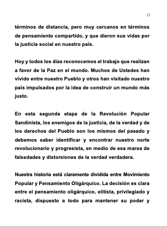 Our history is clearly divided between Popular Movement and Oligarchic Thought. The decision is clear between oligarchic, elitist, privileged and racist thinking, willing to do everything to maintain their power and privileges, including being enablers of foreign intervention; and the Popular Movement that inherits the best of the history of struggle of our People. There are no half measures. In Nicaragua we are a Popular Movement expressed in the Sandinista Popular Revolution.