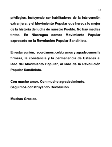 En esta reunión, recordamos, celebramos y agradecemos la firmeza, la constancia y la permanencia de Ustedes al lado del Movimiento Popular, al lado de la Revolución Popular Sandinista.