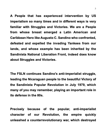 Un Pueblo que ha sido tantas veces y de distintas formas intervenido por el imperialismo norteamericano sabe de Luchas y de Victorias. Un Pueblo que de su seno surge un Héroe Latinoamericano y Caribeño como Augusto C. Sandino quien enfrentó, derrotó y expulsó a los yanquis invasores de nuestras tierras, y cuyo ejemplo es el que hereda el Frente Sandinista de Liberación Nacional, sabe de Luchas y Victorias.