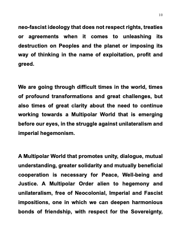 A Multipolar World that promotes unity, dialogue, mutual understanding, greater solidarity and mutually beneficial cooperation is necessary for Peace, Well-being and Justice. A Multipolar Order alien to hegemony and unilateralism, free of Neocolonial, Imperial and Fascist impositions, one in which we can deepen harmonious bonds of friendship, with respect for the Sovereignty, Independence, Self-Determination and Dignity of the Peoples of the World.