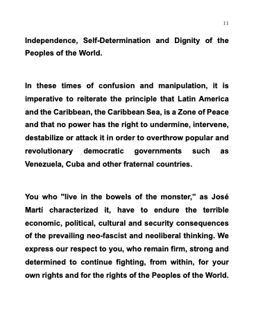 In these times of confusion and manipulation, it is imperative to reiterate the principle that Latin America and the Caribbean, the Caribbean Sea, is a Zone of Peace and that no power has the right to undermine, intervene, destabilize or attack it in order to overthrow popular and revolutionary democratic governments such as Venezuela, Cuba and other fraternal countries.