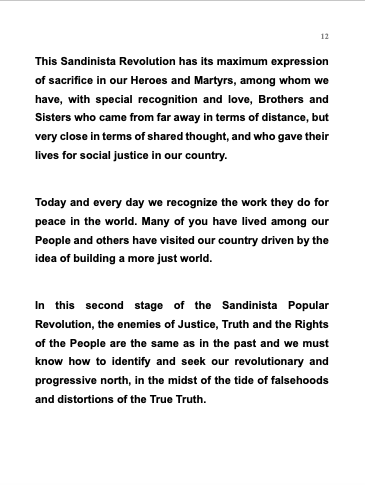Esta Revolución Sandinista tiene su máxima expresión de sacrificio en nuestros Héroes y Mártires, entre los que contamos, con especial reconocimiento y amor, a Hermanos y Hermanas que vinieron desde lejos en términos de distancia, pero muy cercanos en términos de pensamiento compartido, y que dieron sus vidas por la justicia social en nuestro país.