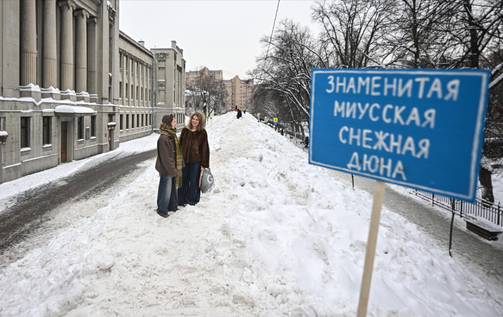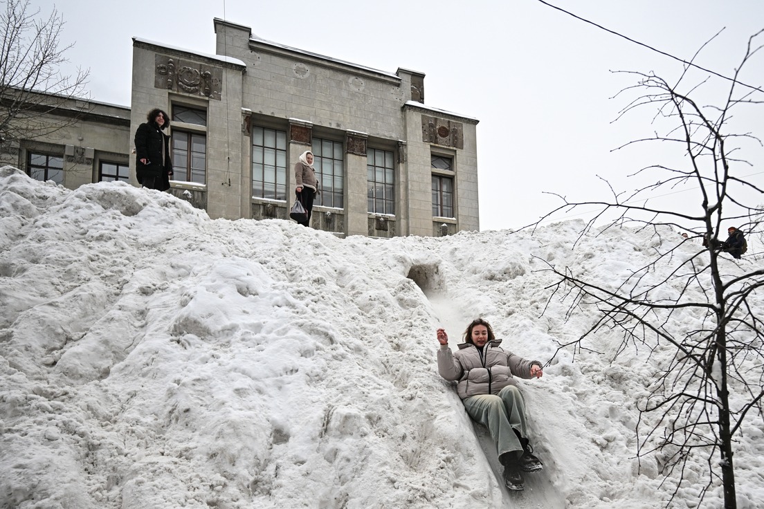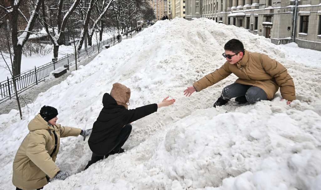 Durante varios días, los moscovitas convirtieron una montaña de nieve de tres metros, levantada tras las recientes nevadas récord, en uno de los lugares más animados del centro de la ciudad.