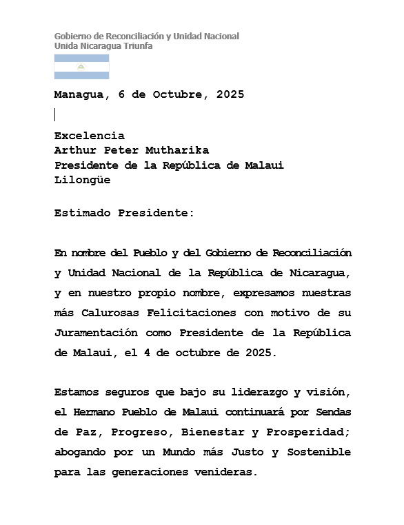 En nombre del Pueblo y del Gobierno de Reconciliación y Unidad Nacional de la República de Nicaragua, y en nuestro propio nombre, expresamos nuestras más Calurosas Felicitaciones con motivo de su Juramentación como Presidente de la República de Malaui, el 4 de octubre de 2025.