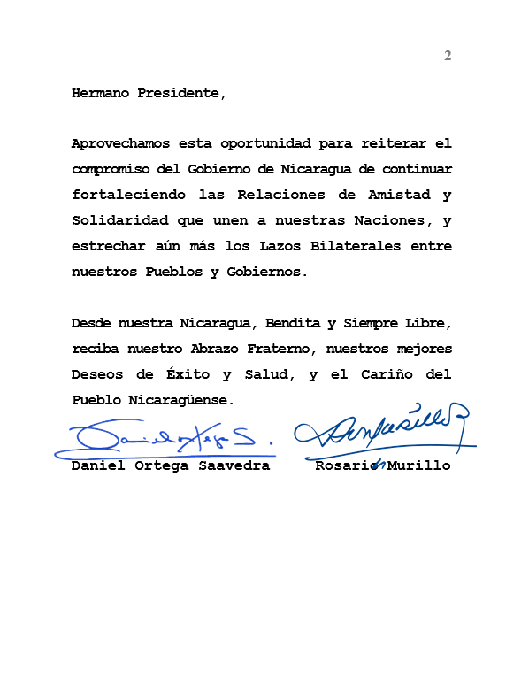 Aprovechamos esta oportunidad para reiterar el compromiso del Gobierno de Nicaragua de continuar fortaleciendo las Relaciones de Amistad y Solidaridad que unen a nuestras Naciones, y estrechar aún más los Lazos Bilaterales entre nuestros Pueblos y Gobiernos.