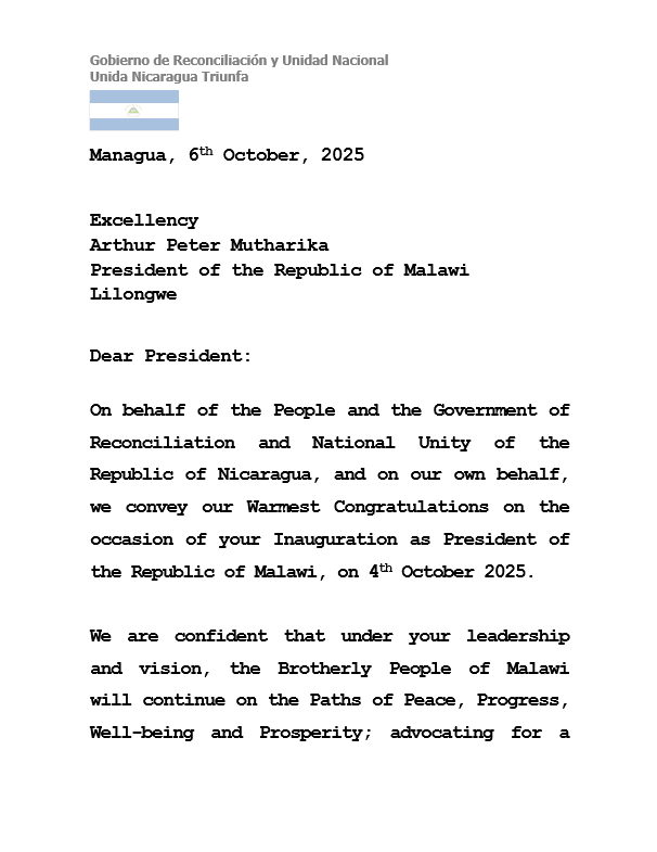 On behalf of the People and the Government of Reconciliation and National Unity of the Republic of Nicaragua, and on our own behalf, we convey our Warmest Congratulations on the occasion of your Inauguration as President of the Republic of Malawi, on 4th October 2025.