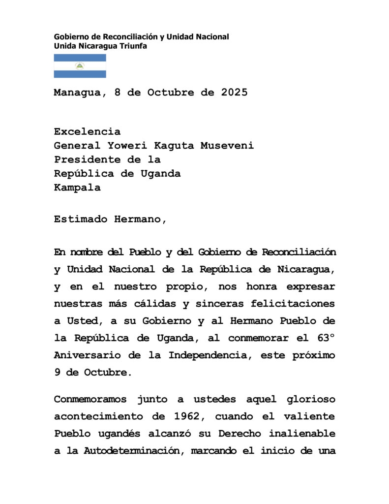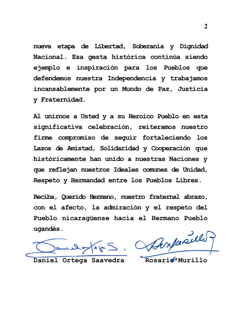 En nombre del Pueblo y del Gobierno de Reconciliación y Unidad Nacional de la República de Nicaragua, y en el nuestro propio, nos honra expresar nuestras más cálidas y sinceras felicitaciones a Usted, a su Gobierno y al Hermano Pueblo de la República de Uganda, al conmemorar el 63º Aniversario de la Independencia, este próximo 9 de Octubre.
