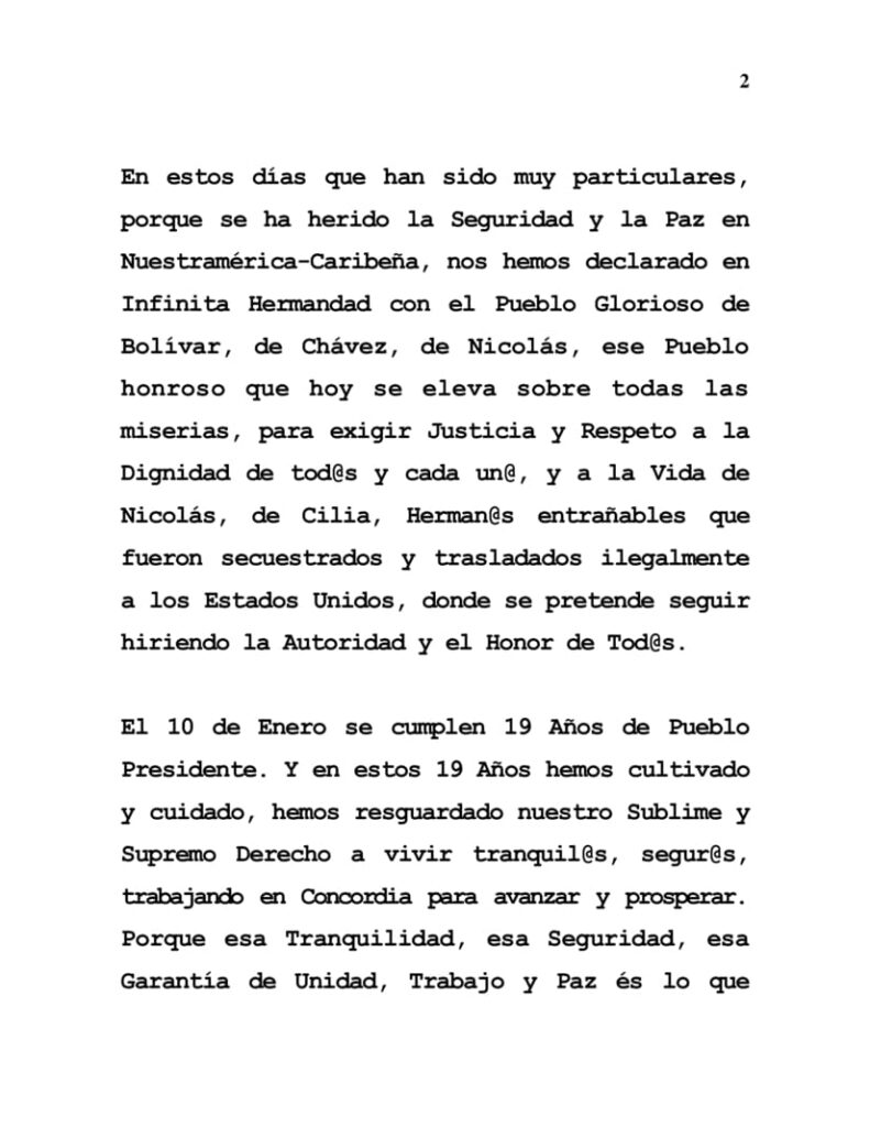 En estos días que han sido muy particulares, porque se ha herido la Seguridad y la Paz en Nuestramérica-Caribeña, nos hemos declarado en Infinita Hermandad con el Pueblo Glorioso de Bolívar, de Chávez, de Nicolás, ese Pueblo honroso que hoy se eleva sobre todas las miserias, para exigir Justicia y Respeto a la Dignidad de tod@s y cada un@, y a la Vida de Nicolás, de Cilia, Herman@s entrañables que fueron secuestrados y trasladados ilegalmente a los Estados Unidos, donde se pretende seguir hiriendo la Autoridad y el Honor de Tod@s.