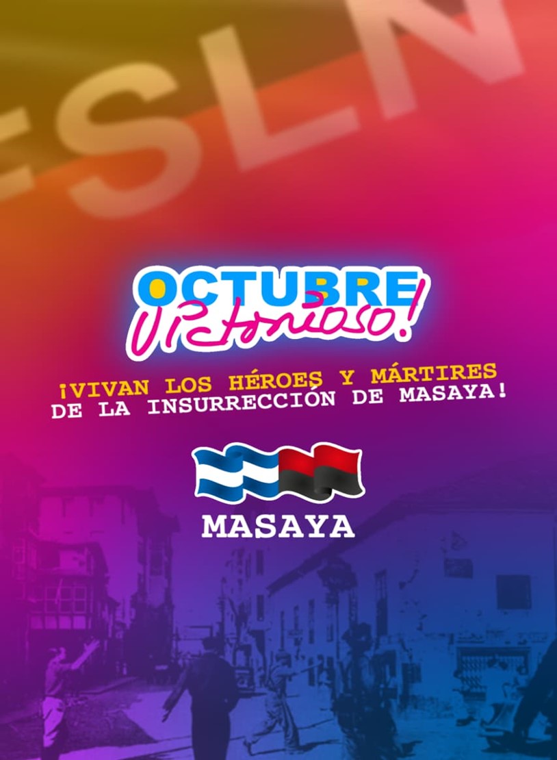- Diana “Octubre Insurreccional” Honor y Gloria a los Héroes del 17 de Octubre a 48 años de la Toma del Cuartel de Masaya. Viernes 17 de Octubre. Principales Calles de Masaya, Nindiri, Masatepe y Nandasmo. 6:00 AM.