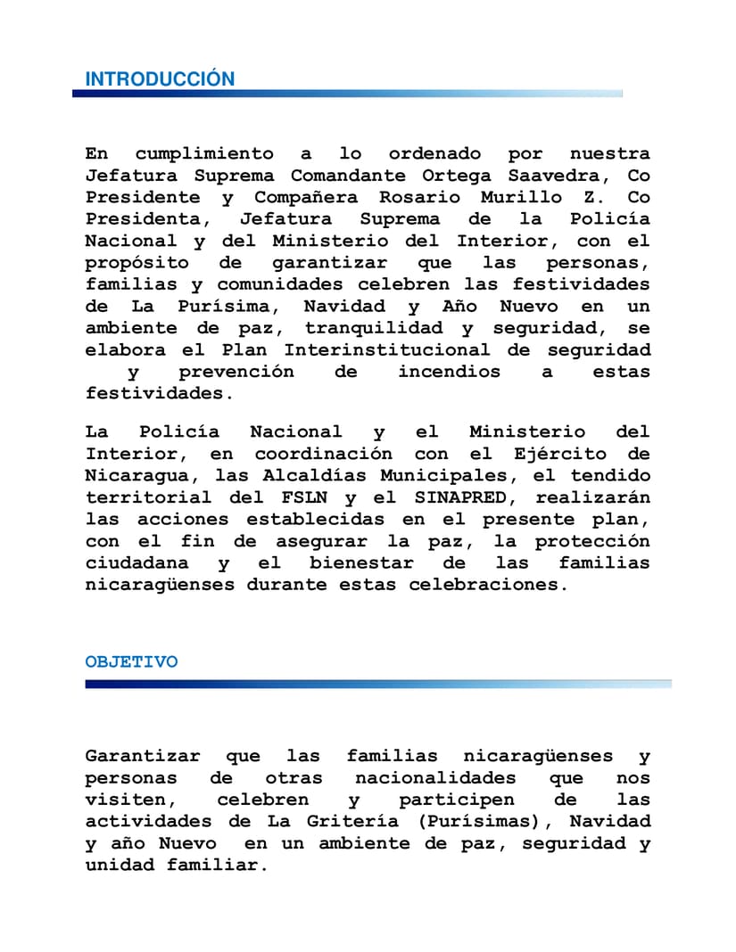 En cumplimiento a lo ordenado por nuestra Jefatura Suprema Comandante Ortega Saavedra, Co Presidente y Compañera Rosario Murillo Z. Co Presidenta, Jefatura Suprema de la Policía Nacional y del Ministerio del Interior, con el propósito de garantizar que las personas, familias y comunidades celebren las festividades de La Purísima, Navidad y Año Nuevo en un ambiente de paz, tranquilidad y seguridad, se elabora el Plan Interinstitucional de seguridad y prevención de incendios a estas festividades.