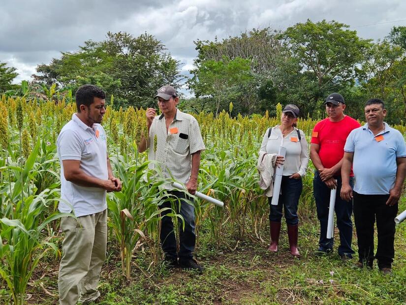 Los productores hicieron recorrido por la parcela, para conocer el manejo agronómico, el proceso de mejoramiento genético realizado y las características relevantes de la variedad INTA Chontales, de porte bajo que facilita la cosecha del grano.