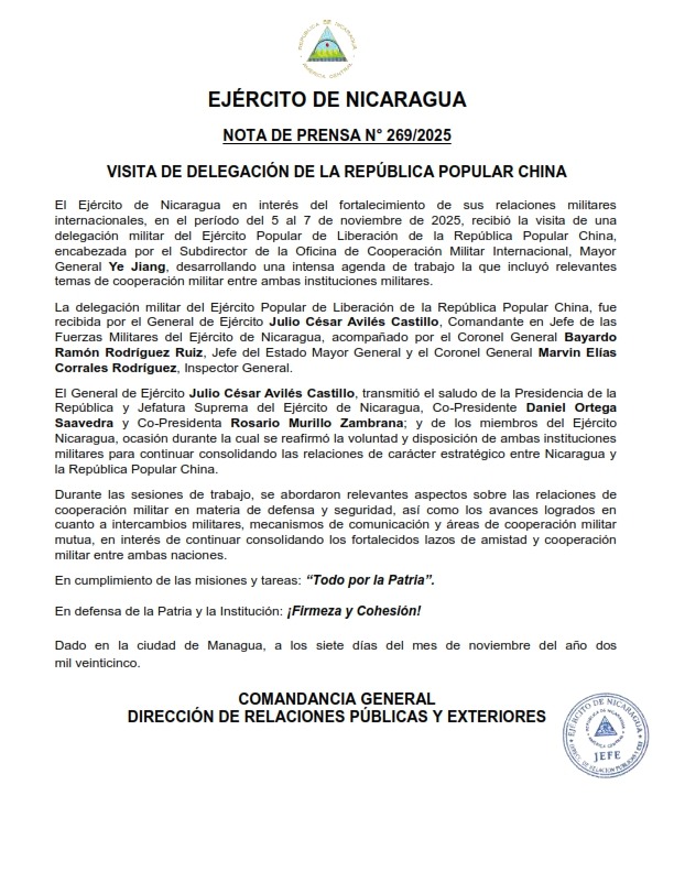El Ejército de Nicaragua en interés del fortalecimiento de sus relaciones militares internacionales, en el período del 5 al 7 de noviembre de 2025, recibió la visita de una delegación militar del Ejército Popular de Liberación de la República Popular China, encabezada por el Subdirector de la Oficina de Cooperación Militar Internacional, Mayor General Ye Jiang, desarrollando una intensa agenda de trabajo la que incluyó relevantes temas de cooperación militar entre ambas instituciones militares.